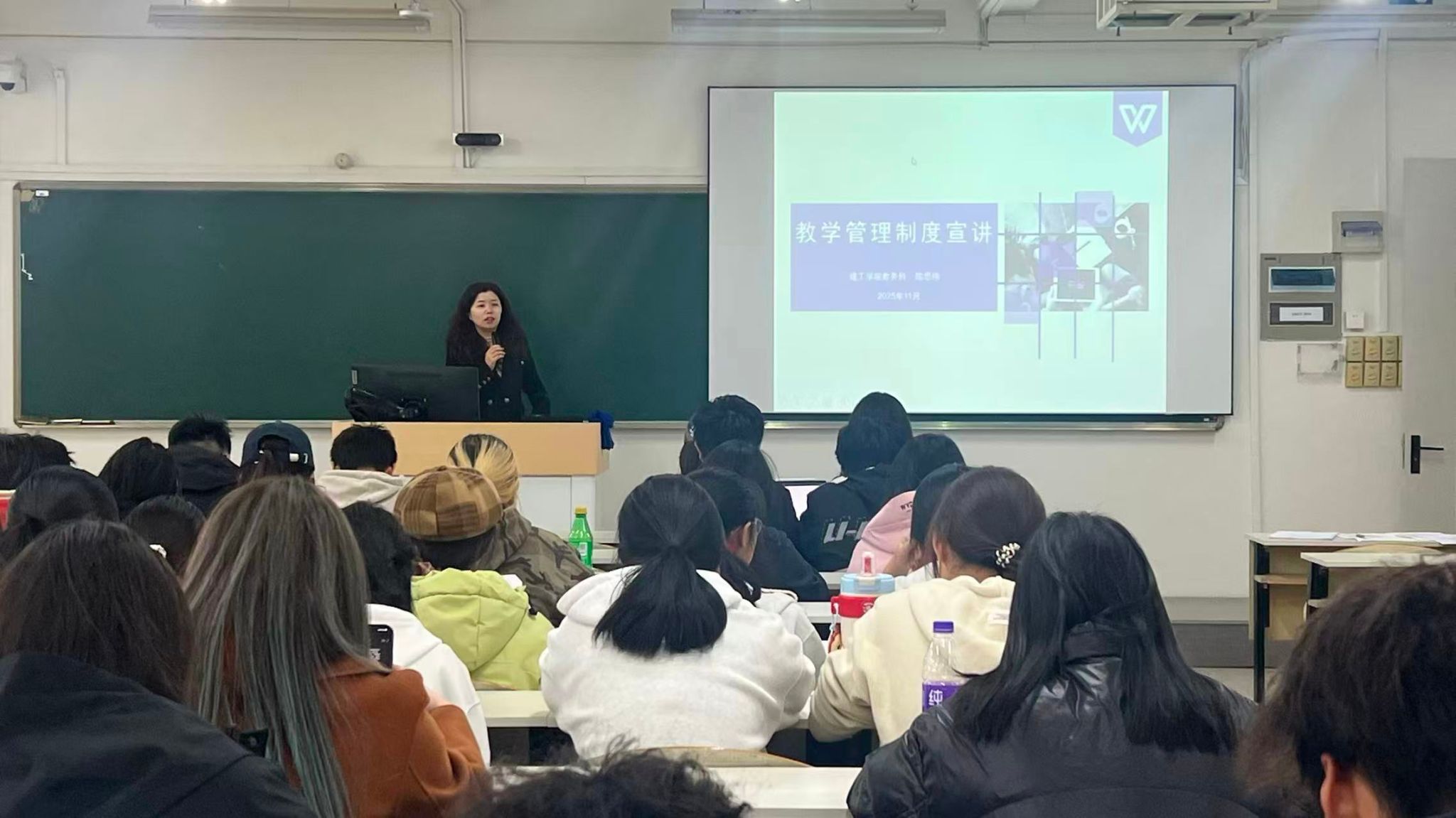 会议围绕“制度解读”与“学涯导航”两大主题展开。陈思玮老师结合人才培养方案、学籍管理、学分制与学位授予制度等关键内容,以“五句叮咛”寄语新生端正学习态度、树立规范意识,并通过14个往届学生的真实案例分析,生动说明了学业过程中可能遇到的常见问题与应对策略,提醒同学们严守纪律、注重过程、合理规划。