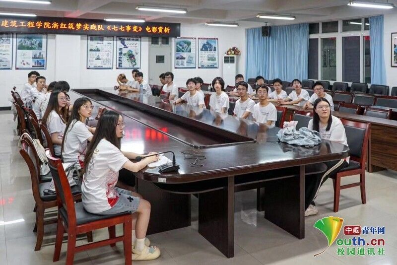 图为实践队队员赏析电影《七七事变》。奚炫非 供图