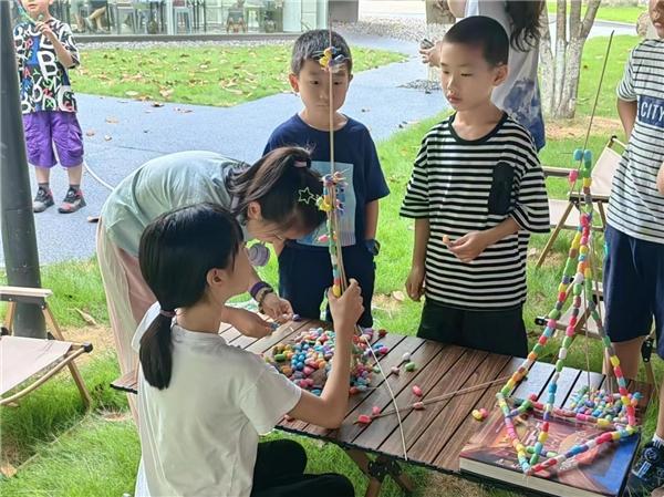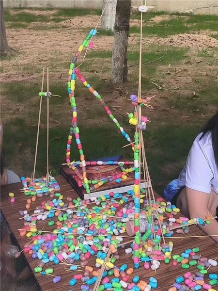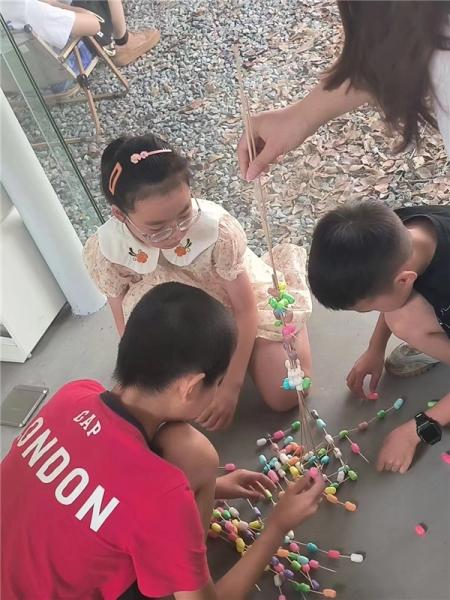 暑期实践队和小朋友们一起开展了一堂“温大第一高楼”建设大比拼。活动利用牙签、木棍与彩色泡沫球搭接,进行“建设大比拼”,对比各组的搭建高度。