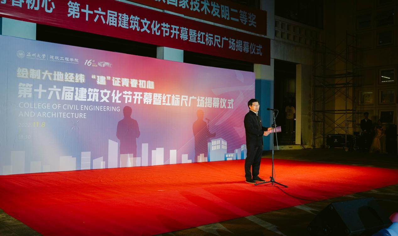 党委书记刘青松致辞中表示,“建筑文化节”是学院重点打造的校园文化品牌,通过开展丰富多彩的建筑文化活动,培养大学生的创新思维和实际动手能力,促进同学们德智体美全面发展;“红标尺广场”揭幕是继“红标尺长廊”后的又一学院力作,“红标尺”作为学院党委近年来着力打造的党建文化品牌,“标尺”作为建筑行业最基础的测量工具,学院希望同学们人生有尺、做人有度,包含了对同学们的期望;时光慢递!给四年、五年后的自己写一封信,是学院的传统项目,小小的鸟巢承载了同学们对未来自己的真挚祝愿,期盼在大学时光里起航新的梦想,扬帆新的人生。