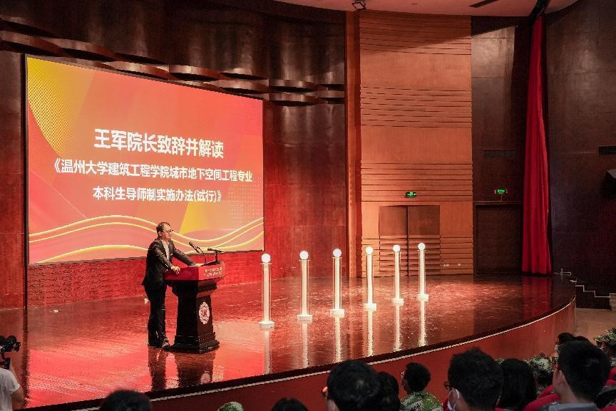 院长、国家技术发明二等奖获得者王军在南校区音乐厅举行2022级城市地下空间工程专业导师结对仪式上慷慨发言。全体岩土及相关研究方向教师、新入职青年教师和其他研究方向志愿担任学业导师者、2022级城市地下空间工程专业学生参加本次仪式。