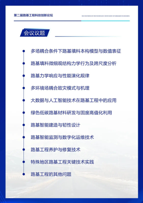 本次论坛以“交通强国战略下的路基工程创新与可持续发展”为主题,聚焦复杂环境路基工程的前沿科学问题与关键技术难题,深入探讨智能化、生态化、低碳化的路基工程技术路径。论坛旨在促进多学科交叉融合,搭建产学研协同创新的高端平台,为我国交通基础设施的高质量发展提供坚实的科技支撑。