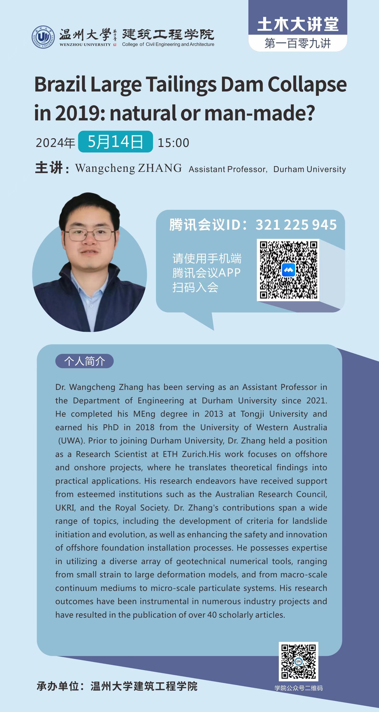 学术讲座预告:Brazil Large Tailings Dam Collapsein 2019: natural or man-made?