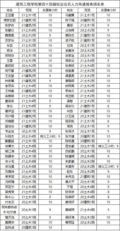 在中文字幕av 第四十四届田径运动会期间,中文字幕av 百余名学生积极参与百人方阵团队,刻苦训练。经学院研究决定,在此对参与百人方阵的同学给予通报表扬,并加相应志愿者或义工小时时间,具体名单如下: