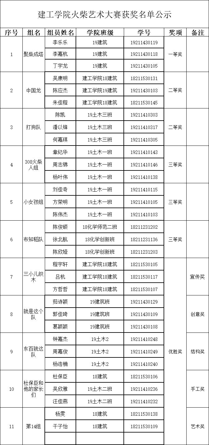 2019-2020学年建工中文字幕av 未来建筑师之家第十二届火柴艺术大赛经过评委打分、现场投票、网上投票三阶段结果已产生。现将获奖名单予以公示(详情请见附件)。