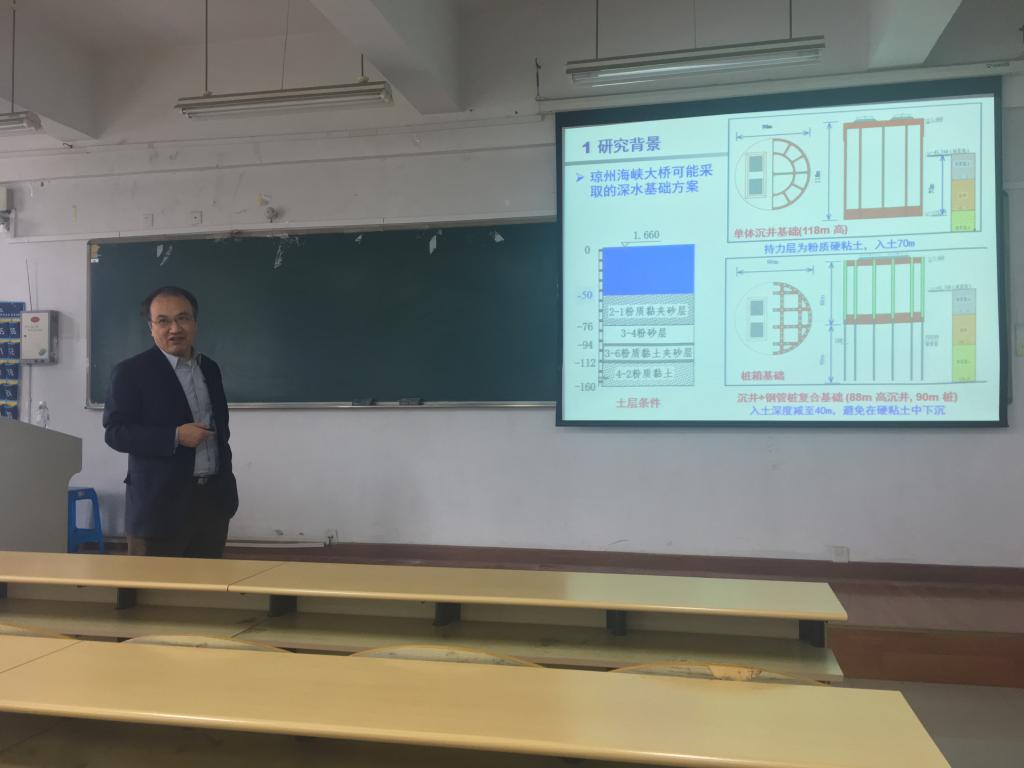 开展学术访问和交流。当天下午14:00,黄茂松教授在建工学院7D302做了题为“跨海桥梁深水基础动力响应与循环累积变形特性”的讲座。讲座由谷川老师主持,学院教师和研究生共50余人参加了讲座。