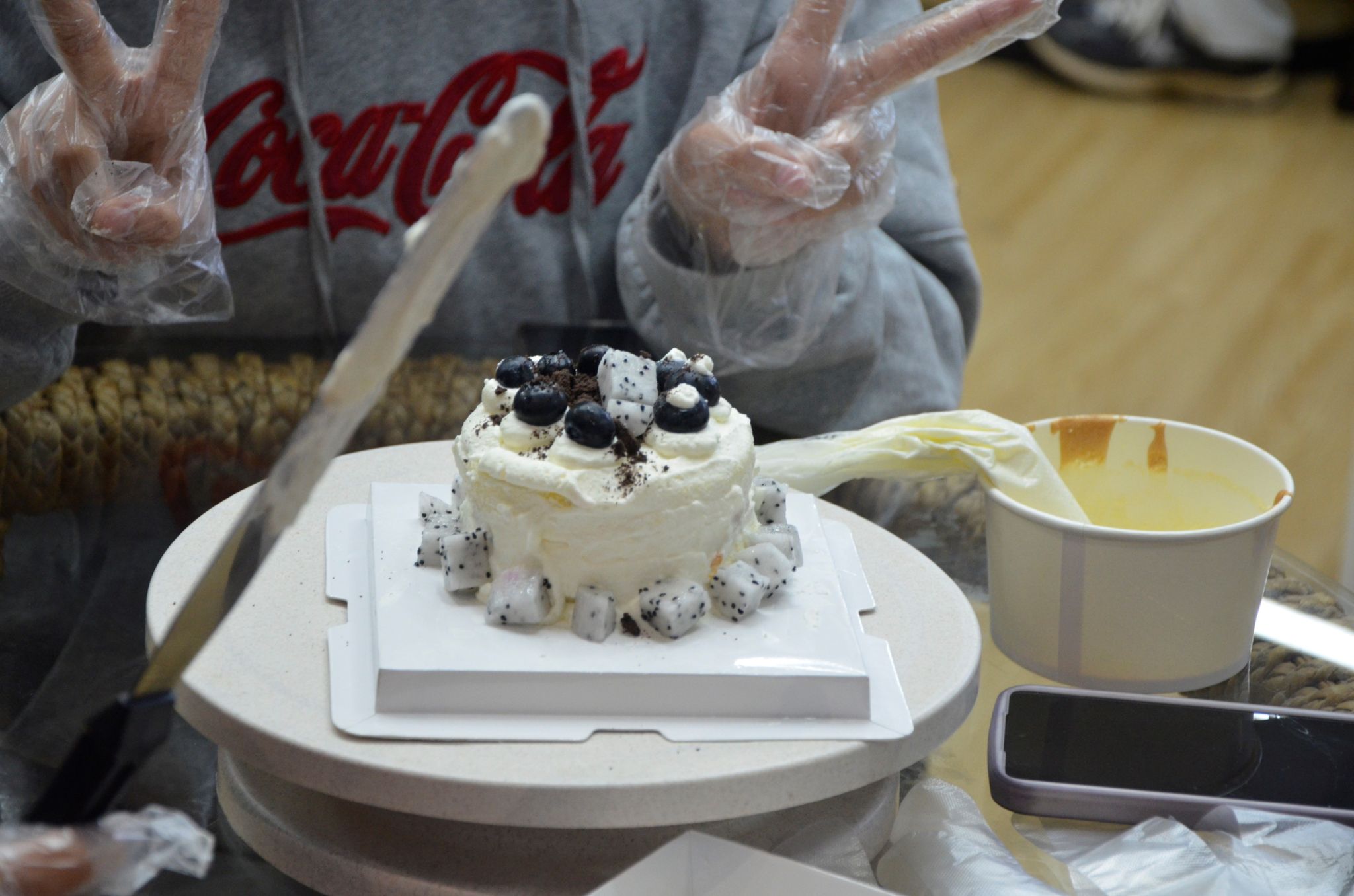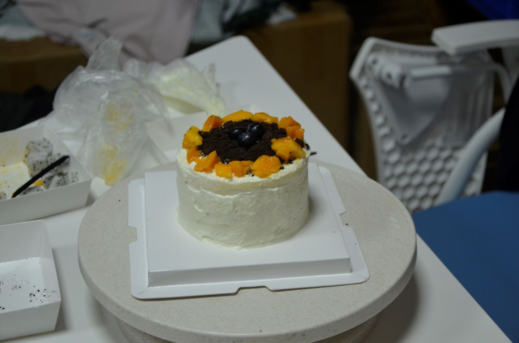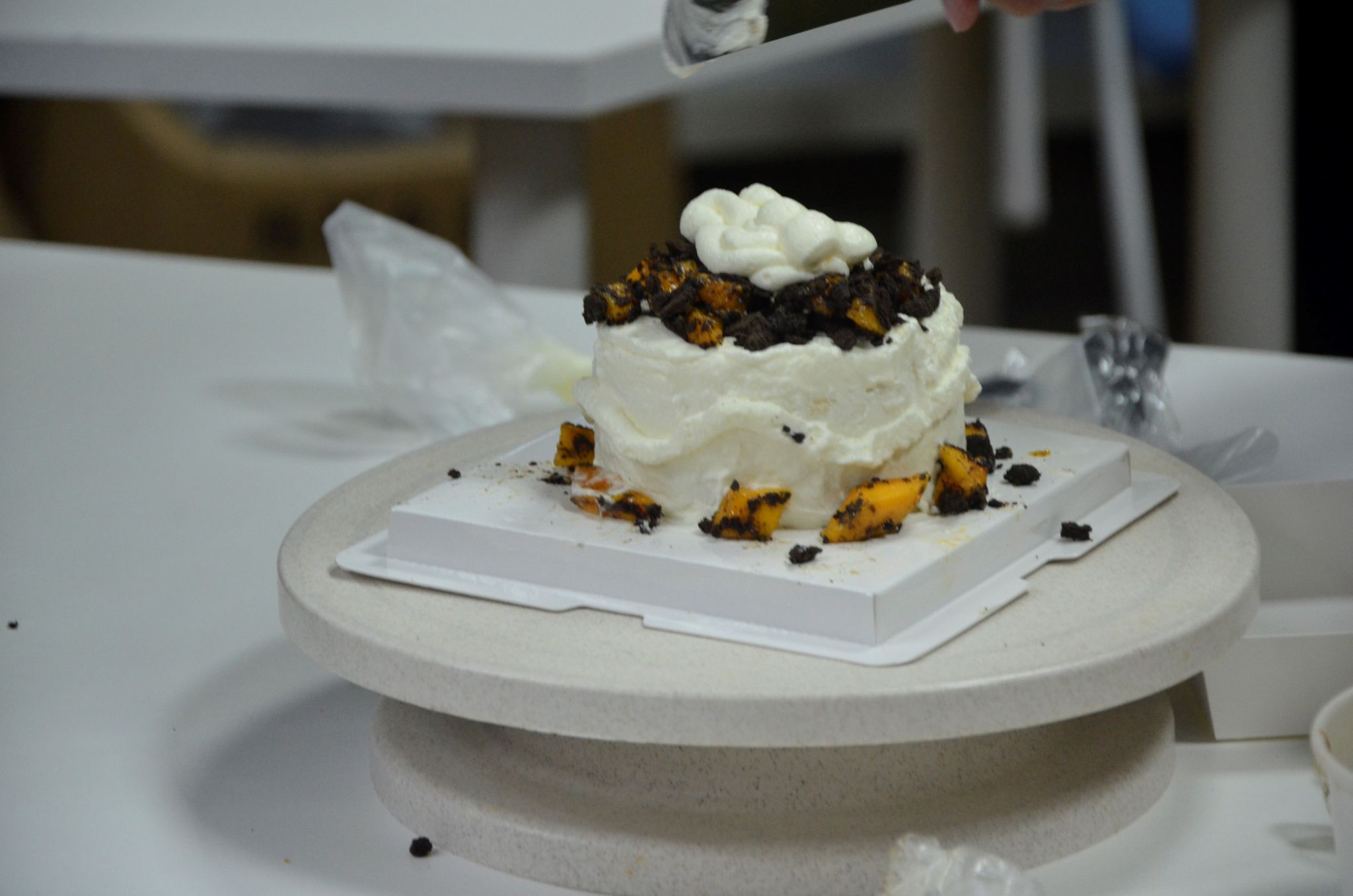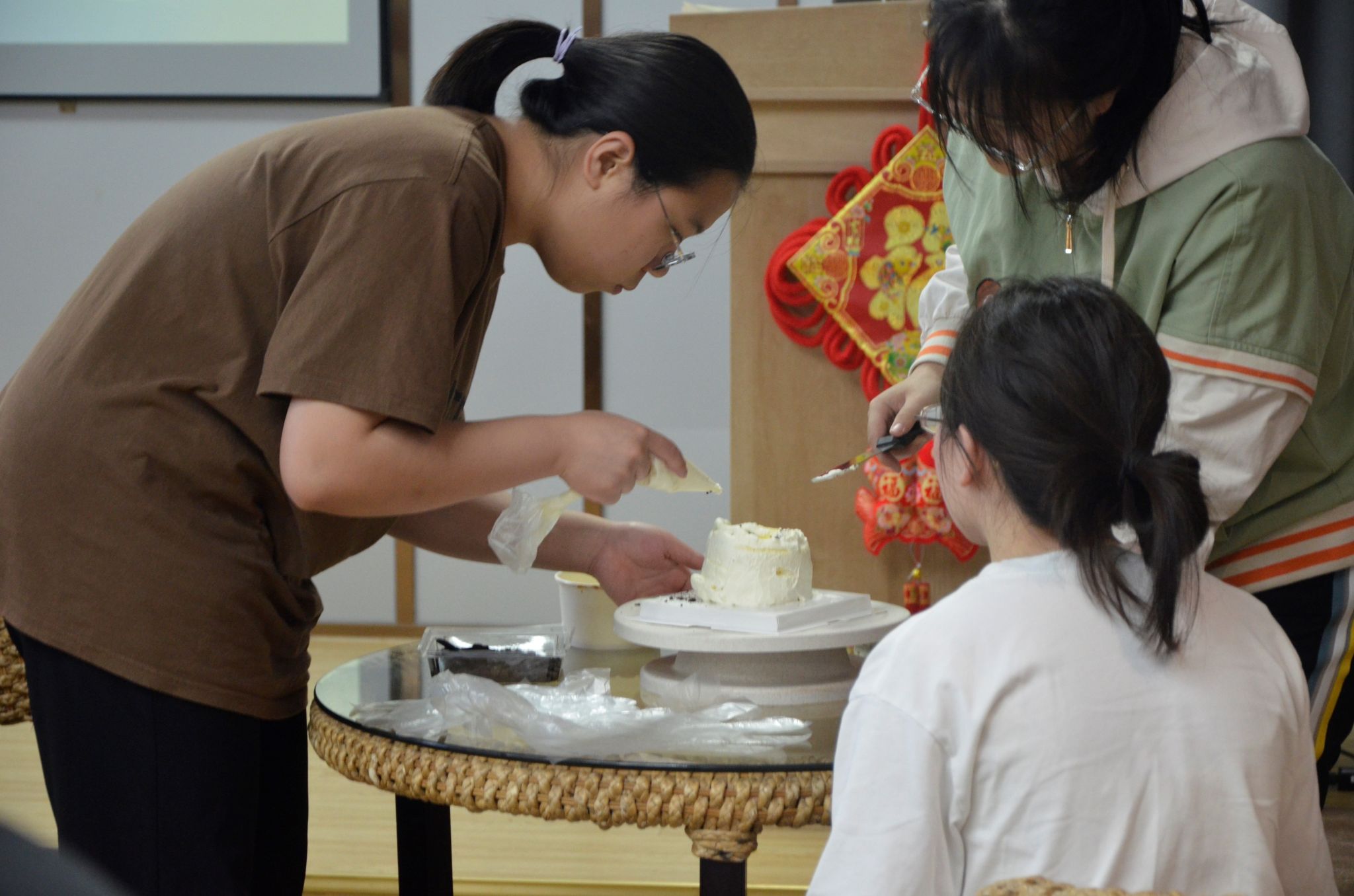活动现场,工作人员为大家发放了奶油、水果等材料并讲解了蛋糕淋面的方法。制作蛋糕环节,同学们在烘焙师的指导下,握起裱花袋,充分发挥自己的想象力和创造力,把各种水果、饼干组合搭配,创作出各种精美的蛋糕款式。教室被奶油的香甜包围着,快乐在香甜中弥漫,同学们激动又惊喜地记录下自己亲手制作的小蛋糕。