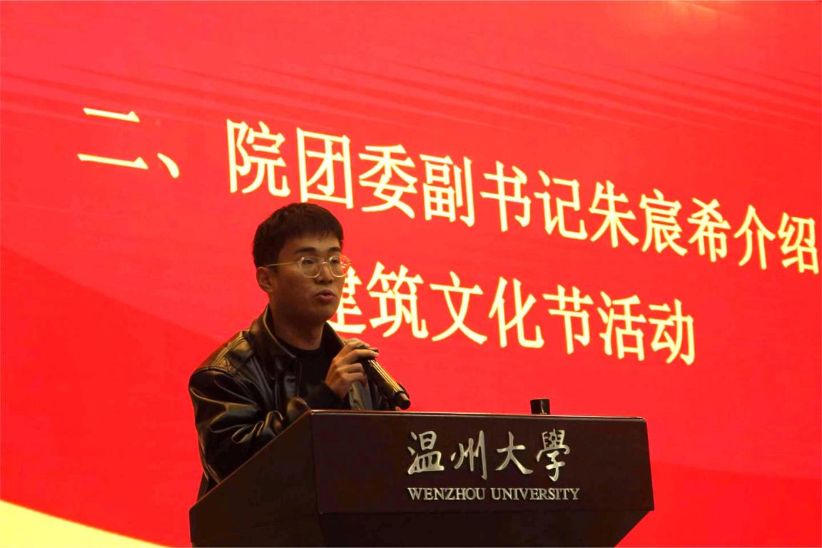 团委副书记朱宸希介绍建筑文化节活动安排。他指出,本届建筑文节突出学术性、专业性、健康性和示范性,内容包括“学术氛围,开拓思维”“文武双全,德才兼备”“文体盛会,青春律动”“榜样力量,筑力远航”“贴近职业,创意无限”等五大板块内容。活动历时近一年,通过丰富多样的各类活动,优化院风学风,繁荣校园文化,培育学院精神,滋养师生心灵,引领社会风尚。