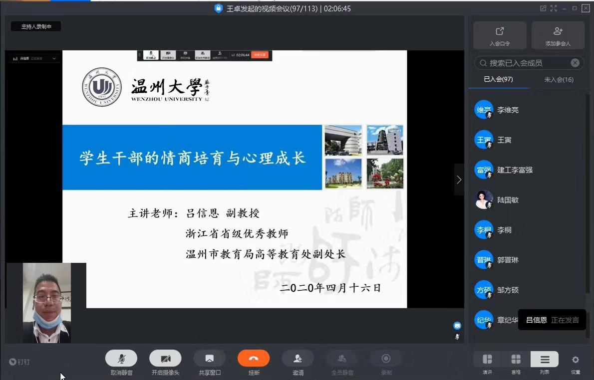 第七次学生干部培训“学生干部的情商培育与心理成长”在钉钉线上顺利开展。本次课程的主讲人为温州市教育局高等教育处副处长吕信恩老师。团委·学生会指导老师、辅导员刘良友老师担任本次培训课程的主持人,院研究生会、党员服务中心、团委·学生会全体成员及各班班委参加了本次课程。