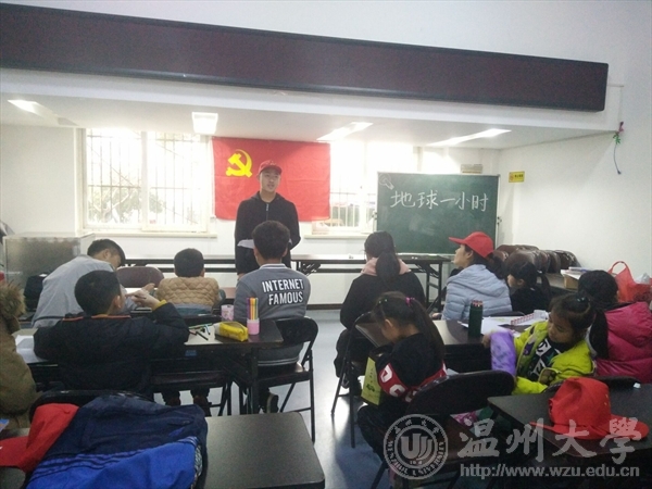 中午12点,天公不作美,天空被乌云所笼罩,然而这湿冷的天气阻挡不了我们的热情,我们便出发了,乘上公交车便向着目的地而去。由于社区阿姨的请假,我们开门晚了,在门口我们和小朋友们耐心地等待着,有不少小朋友早就来了,甚至已经来了有一个小时了,可见小朋友们还是很期待、很喜欢我们的爱心家教的,这让我们很开心。不久就我们便取来了钥匙,进入了教室,准时开始了我们的家教活动活动。“地球一小时”活动的临近,我们在这次的爱心家教中向小朋友们宣传介绍了关于“地球一小时”的知识,并且写下了倡议书,不论是志愿者还是小朋友都非常高兴地在上面签下了自己的名字,以表示自己对活动的支持和参与。