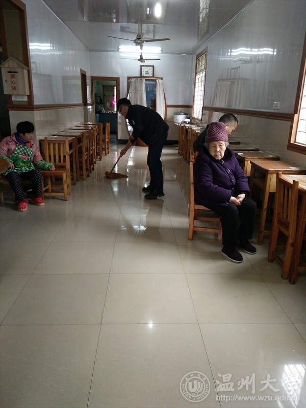早上在两位青协成员的带领下,志愿者们来到了丽岙茶堂,在照料负责人和青协成员的安排下,志愿者们和青协成员首先为老人们擦吃饭的桌子,大家齐心协力,在轻松愉悦的环境下完成了任务。之后,青协成员和志愿者们去旁边的河塘帮老人洗衣服和洗被单。尽管这是一份很重的工作,但大家还是非常卖力,大家都互相交流、聊天,时间过去了,大家也将衣服和被单洗完了。所有人都休息了一会儿,然后去老人们的院子里打扫树叶,即使刚刚下过雨,但每个人都尽全力去扫。天公不作美,雨又开始下了,大家只能作罢。吃饭时间的时候,负责人端上了一桌的好菜,并且不断感谢和夸奖我们。到了下午,雨停了,我们就把剩下的树叶扫完了。最后,我们去了一个老人的家里,帮助他搞卫生。到了最后要走的时候,负责人还一直感谢我们,我们就这样回到了学校。