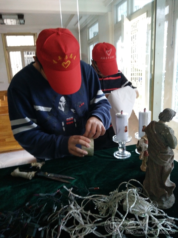 南门,经过长时间的车程,最终在八点四十分到达了目的地。与福利院陈阿姨的交流下,志愿者们明确了自己的任务,工作便井然有序的进行着。首先,志愿者们带着搓斗、扫帚等工具,对院子里的卫生逐一进行清理。志愿者们有的清理落叶,有的对清理周围的垃圾。同时志愿者们与阿姨亲切的交谈,陈阿姨给志愿者拿来一些水果与饼干,志愿者受到了阿姨的热情款待,然而志愿者们向阿姨道了声谢,并没有接受,在不断地劝说声中,阿姨只好作罢。短暂的休息之后,阿姨带着志愿者们布置房屋,在平安夜与圣诞节到来之际,带来一个温暖温馨的节日,为爷爷奶奶带来节日的气氛。阿姨买来了布置房屋需要的用品,志愿者们搬来梯子张贴圣诞老人,装扮圣诞树,贴窗贴等。