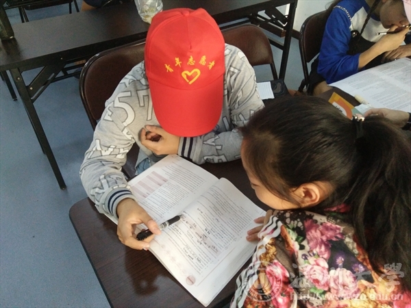 11月19日12:40,天气晴朗,万里无云,湛蓝的天空中,一轮灼热的太阳照耀着大地,前几天还挺冷的,但今天缺突然转热了,天气的变化突然,并不能阻挡志愿者们的热情,大家的热情和这太阳一样猛烈。当志愿者们抵达之时,有小朋友先到了,其中有一个二年级的小女孩和四年级的小男孩,两人都特别地活泼,可又比较怕生,不愿意和其他第一次来的志愿者一起,于是便由建工团学志愿者赵宏嘉阳来教她,小女孩活泼可爱,活蹦乱跳,也淘气的很,一下子让志愿者帮他画画,一下子又说要喝饮料,于是志愿者就和她谈条件,他出两道计算题,全对就去买,当然她全对了。之后她写完了作业,他们又开始了写字比赛,看谁写的字好看,她当然是兴致勃勃的,一副摩拳擦掌蓄势待发的样子。慢慢地志愿者们和孩子们都熟络起来了。志愿者赵宏嘉阳说道,我觉得和小年龄的孩子相处,给予奖励作为鼓励是一种很好的方法,而比赛是另一种很好的方法,孩子总是希望获胜取得奖励的,喜欢比赛,争强好胜,这也是孩子的优点吧。