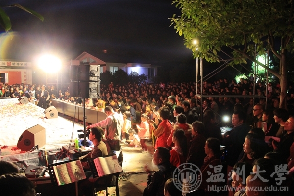 晚上19:00,演出如期开始,观众席上人头攒动,寒冷的天气也抵挡不住群众们的热情,本次演出首先是大妈们的开场舞,大妈们身穿大红的裙子,在寒冷的冬夜舞动着他们曼妙的身躯,吸引了所有观众的目光,最终在一阵雷鸣般的掌声中结束了。随后是文化站林站长、郑书记等各位领导的讲话,林站长阐述了此次演出的意义,以及今后对文化发展的目标的展望。第五个节目则是建工学院带来的小品《梁祝》,两位同学用风趣幽默语言和动作全新诠释了一段凄美的爱情故事,无论老少,观众都沉浸在两位同学精彩的演出中。建工学院带来的第九个节目—相声表演《别人家的孩子》凭借其贴合生活的取材,更是赢得了阵阵掌声,将晚会的气氛推向了高潮。演出结束后,文化站林站长与建工学院的师生进行了合影留念,感谢了建工学院的师生们的辛勤付出,并真诚地赞美了今天精彩的表演。本次新青年下乡活动圆满结束。