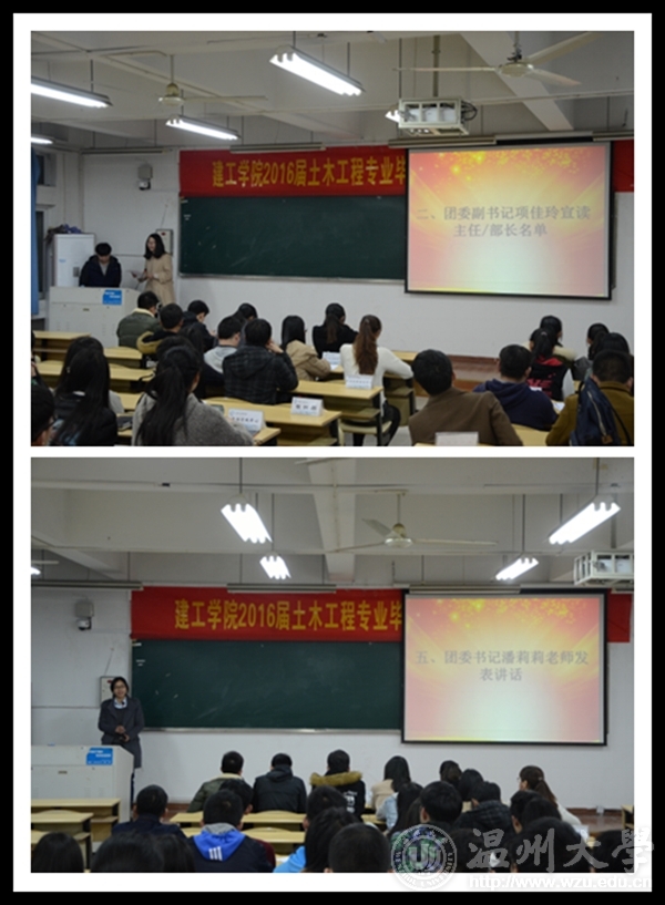 在主持人介绍完嘉宾和团学新成员之后,大会在建工青年之歌的歌声中拉开序幕,团委副书记项佳玲宣读主任及部长名单。随后,青年志愿者协会部长李世袁进行地球一小时活动总结,并展示活动的过程及成果。学生会主席韩晓明进行八元生存日介绍及纪律强调。最后,团委书记潘莉莉老师发表讲话,潘老师从各部门发展、学业情况、院内创业项目等方面进行指导,她用严肃而深切的话语引起同学们的深思反省及对未来的美好展望。本次大会既在总结以往,展望未来,意义非凡。