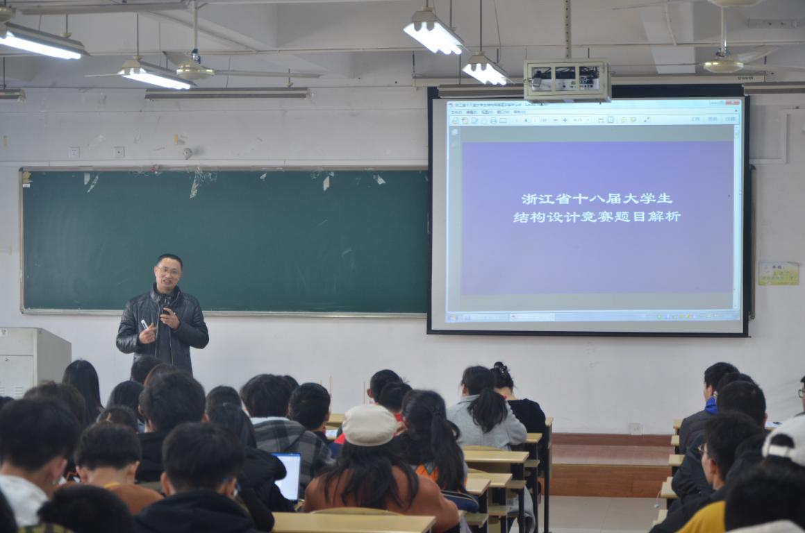 于D座302教室举办了大学生结构设计竞赛培训讲座。主讲人是来自浙江工业大学的王建东老师。