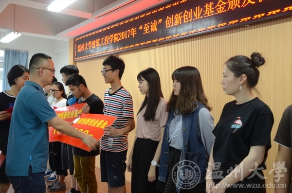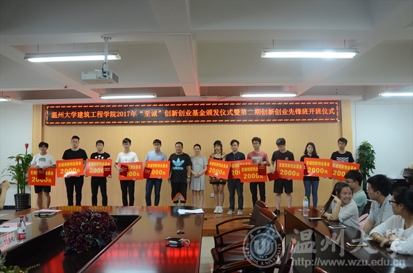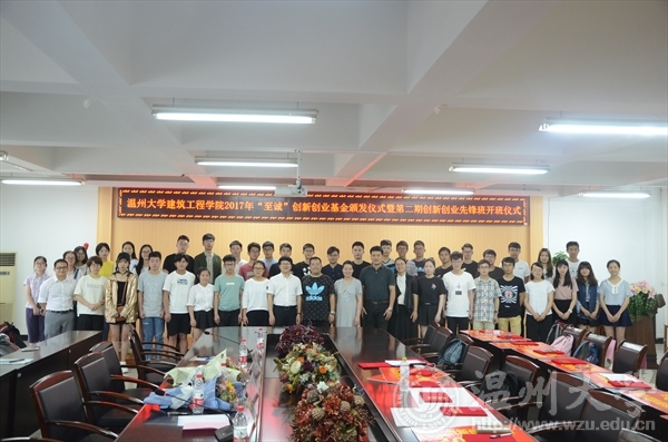 2017年“至诚”创新创业基金颁发仪式暨第二期创新创业先锋班开班仪式在建工学院隆重举行。浙江至诚建设有限公司董事长陈建德、总经理董春华女士、学生处处长张敏、校友办主任杜友坚、教务处副处长赵燕、学院院长孙林柱以及全体获得基金学生代表和学院第二期创新创业先锋班全体学员参加仪式,仪式由学院党总支书记刘青松主持。