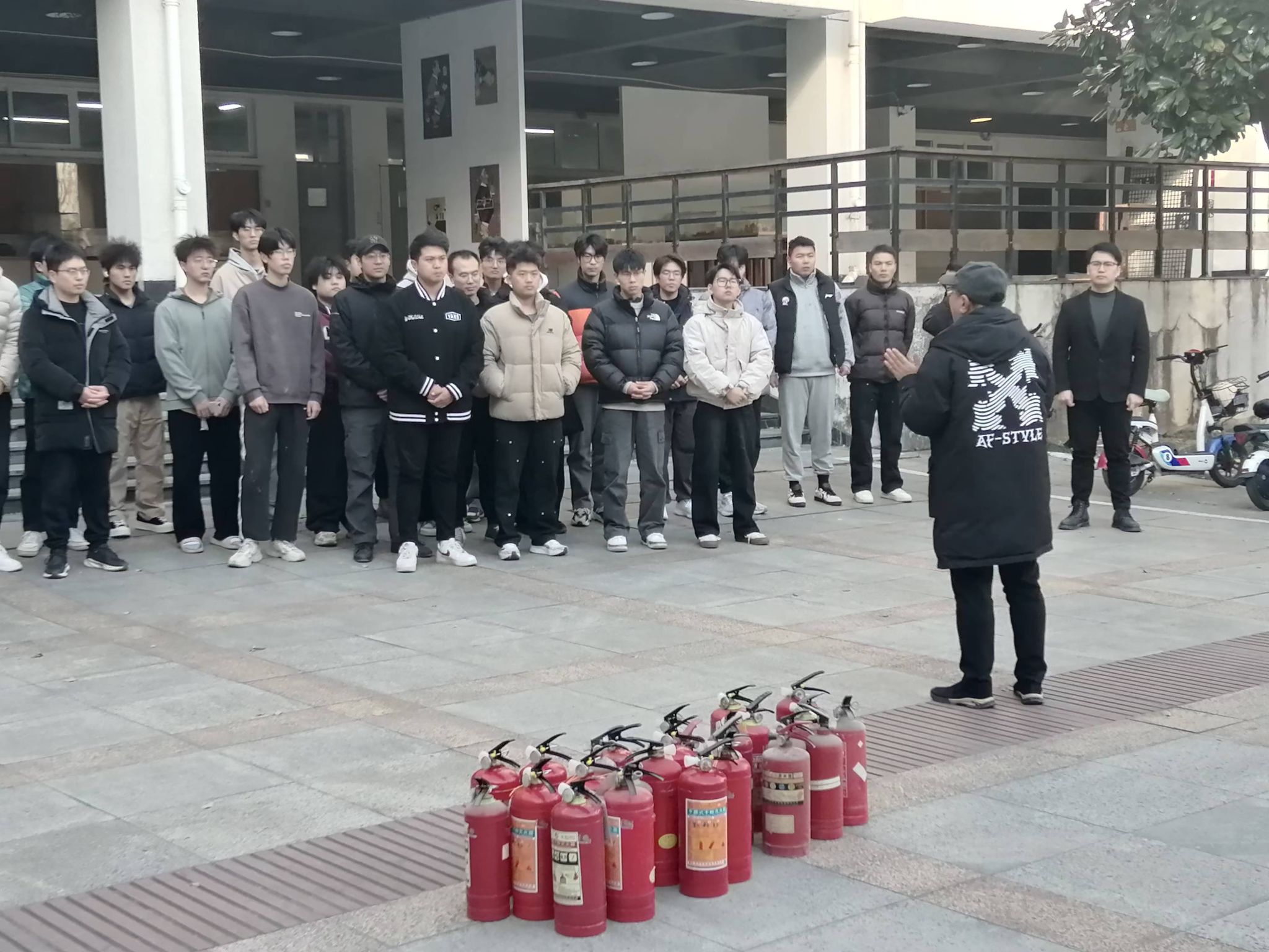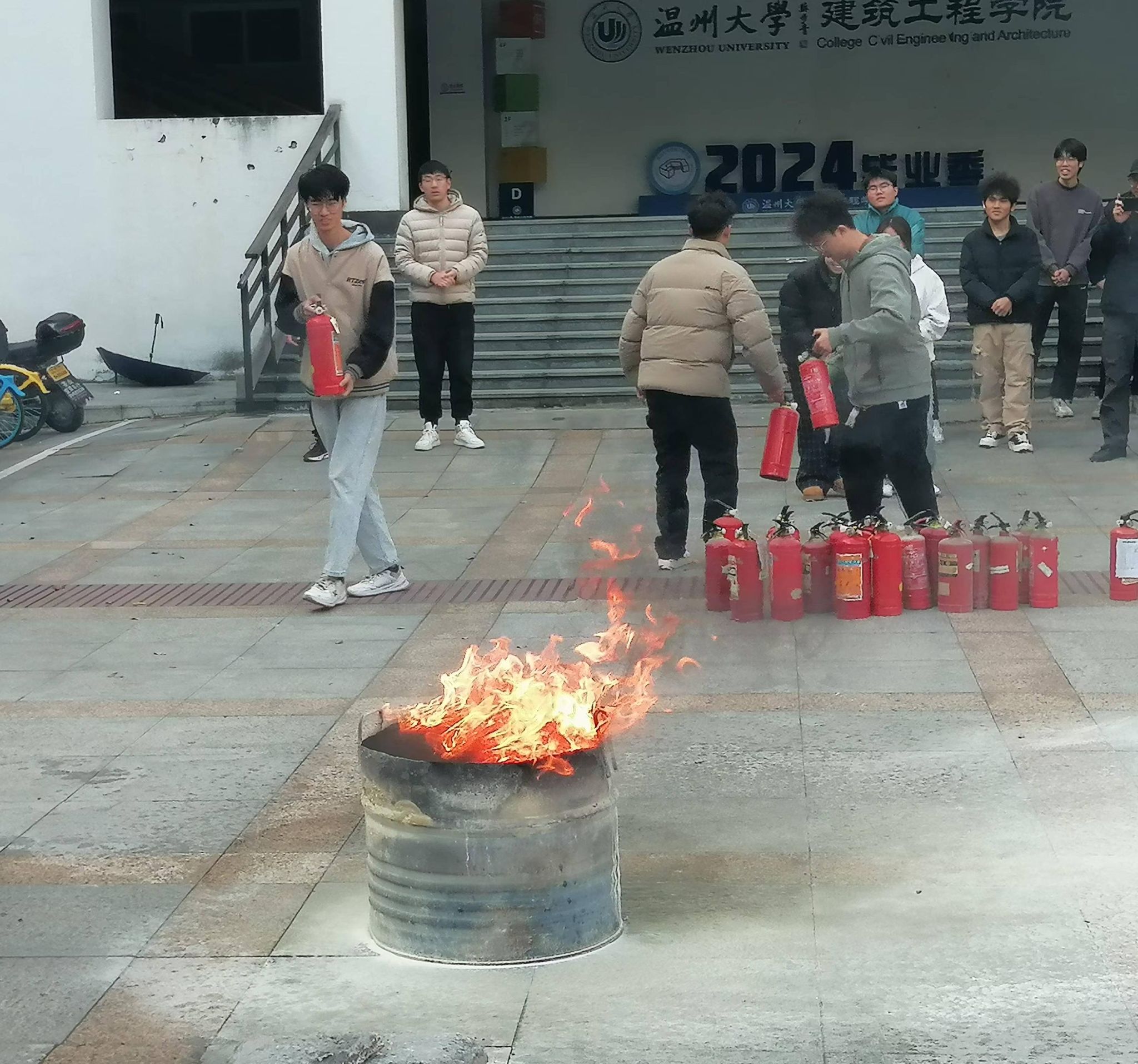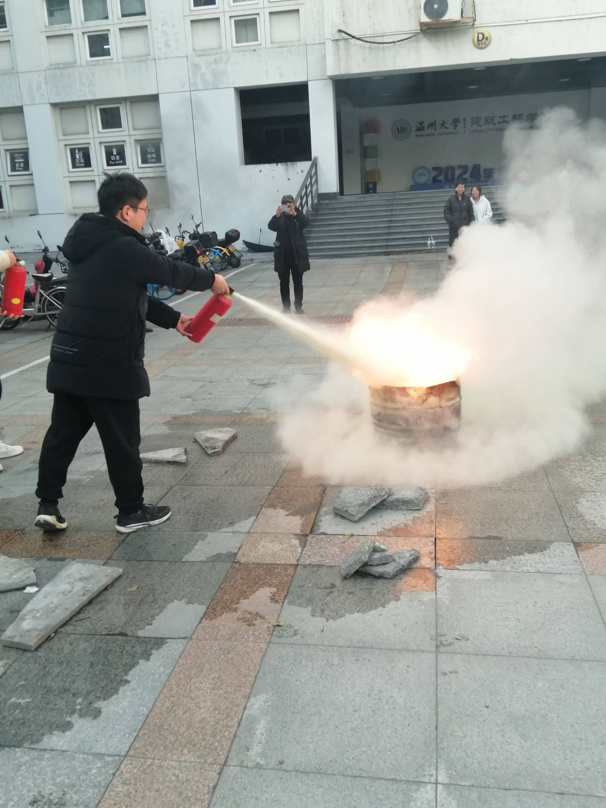 紧接着,演练进入实操环节。保卫处老师在7号楼中庭准备了火源和灭火器,老师和同学们两人一组,亲自操作使用灭火器进行灭火。在整个过程中,师生们表现出了良好的应急反应能力。